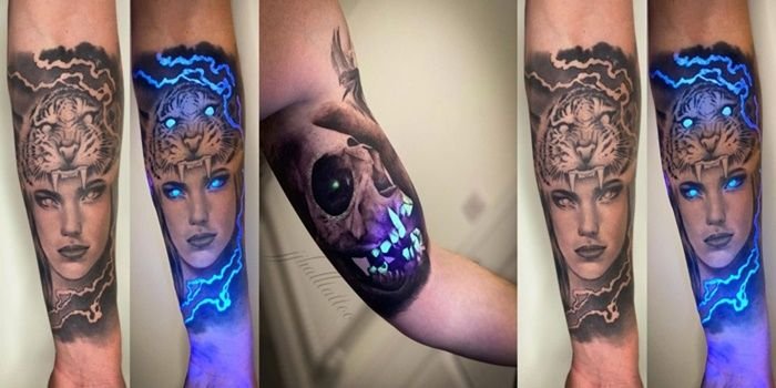 Dalam cahaya biasa, tato UV semi-tidak terlihat, tetapi jika dilihat di bawah bola lampu hitam ultraviolet, akan terlihat dimensi desain yang sama sekali baru.