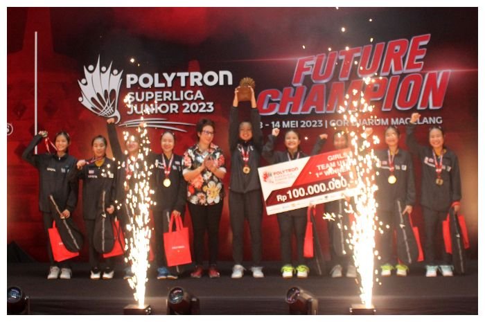 Tim U-17 putri Banthongyord juara di Polytron Superliga Junior 2023 dan merebut Piala Yuni Kartika. OLENAS.ID – Tim U-17 putri Banthongyord meraih sukses di Polytron Superliga Junior 2023. Tim Thailand ini tampil sebagai juara dan merebut Piala Yuni Kartika setelah menang 3-0 atas PB Jaya Raya di laga final di GOR Djarum, Magelang, Sabtu, 13 Mei 2023.