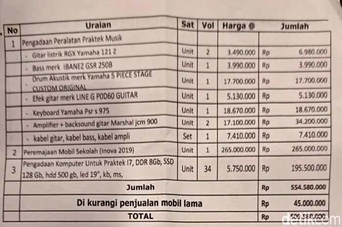 Kemudian pengadaan peremajaan mobil sekolah (Inova 2019) Rp 265 juta dan pengadaan komputer sebanyak 34 unit senilai Rp 195.500.000.